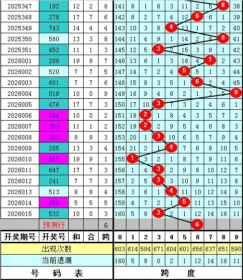 福彩3D第2026015期最大跨度开出3,跨度近期分布比较密集,主要分布在1-5区段,本期预计最大跨度在4-8区段出现,最大跨度关注45678,精选跨度6。