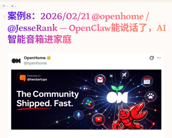第二个是JesseRank作念的OpenHome智能音箱开发套件,让OpenClawagent不错语音交互并禁止腹地电脑。他的agent在情东说念主节"偷听"到他和女一又友的对话,主动提醒他情东说念主节快到了,还给了提议。完全莫得被指示。社区一周内孝顺了十几个语音插件。上了TWiST播客E2253。