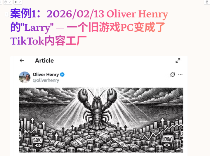 OliverHenry把旧游戏PC装Ubuntu跑OpenClaw,agentLarry每天自动生成TikTok轮播图,5天冲破50万播放,一周800万。appMRR从0涨到$670/月。skill文献从50行自我迭代到500+行,接了RevenueCat看完整变嫌漏斗。教程帖在X上700万播放。