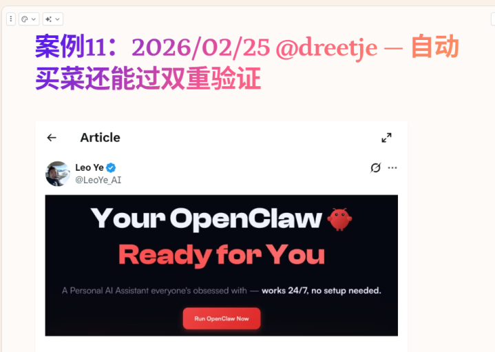 这个案例还激勉了一段对于飞书的接头。我说我前几天写了一篇著述讲"为什么飞书是这一波龙虾的受益者",履行上是因为飞书作念居品的时候就预思到有这样一天。灌音杰出弥留,是以有了飞书妙记;数据杰出弥留,是以有了飞书数据库;群聊杰出弥留,是以有了完整的群聊体系。
