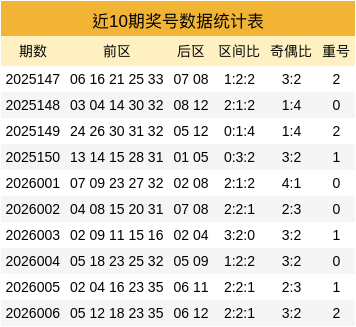 近10期前区的三区比为15:18:17,其中前2区出号数较多,1区前区出号数较少。上期前区三区比为2:2:1,1区前区表现较强。本期关注三区比2:2:1。