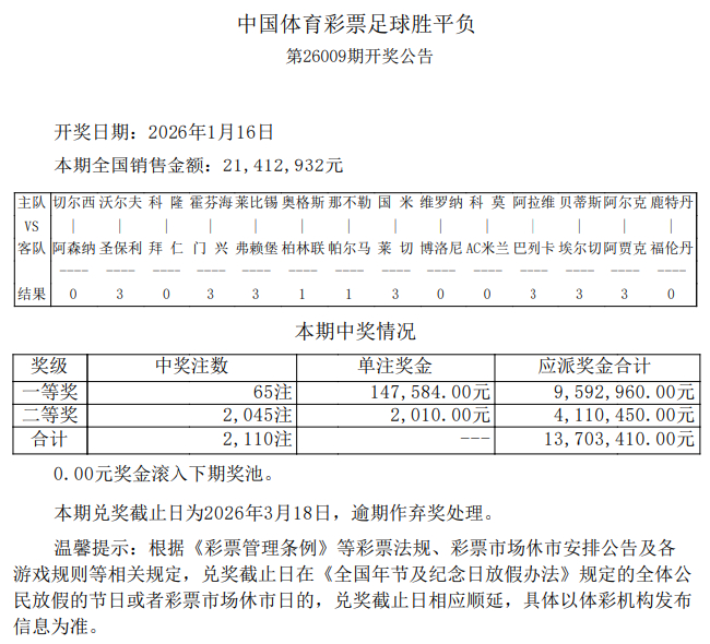 北京时间1月16日,足彩第26009期开奖结果揭晓。本期足彩共开出65注,单注奖金147,584元;二等奖开出2045注2010元;任九开9408注1167元。本期胜负彩销量为21,412,932元,任九投注总额为17,160,302元。