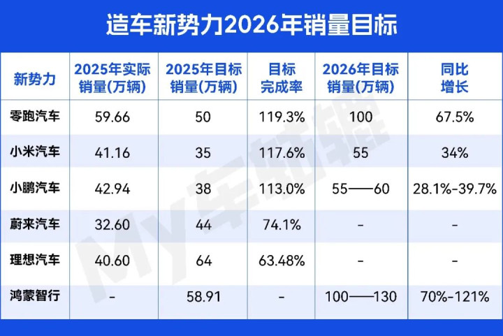 与传统车企不同,造车新势力及其他新能源品牌都制定了较高的增长目标。尽管2025年这些新造车企业的目标达成情况并不理想,但基于新能源汽车市场的快速发展和日益激烈的市场竞争,它们依然选择了冲刺高增长。