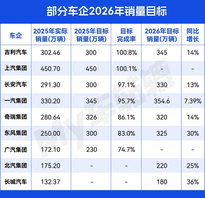 在刚刚过去的2025年,中国汽车产销再创历史新高,累计分别完成3453.1万辆和3440万辆,同比分别增长10.4%和9.4%。其中,比亚迪、上汽、吉利等车企,2025年销量均实现了不错增长。在此基础上,近日多家车企面向2026年相继提出了更高的销量目标,正式开启车市新一轮激战。